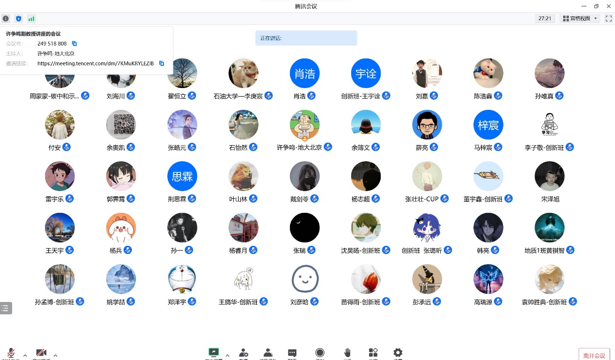 2022年11月10日,碳中和示范性能源学院周蒙蒙副教授和武晓光讲师共同邀请中国地质大学(北京)许争鸣副教授,通过腾讯会议分享了精彩的学术报告——《大位移水平井井眼井筒清洁理论及技术》。