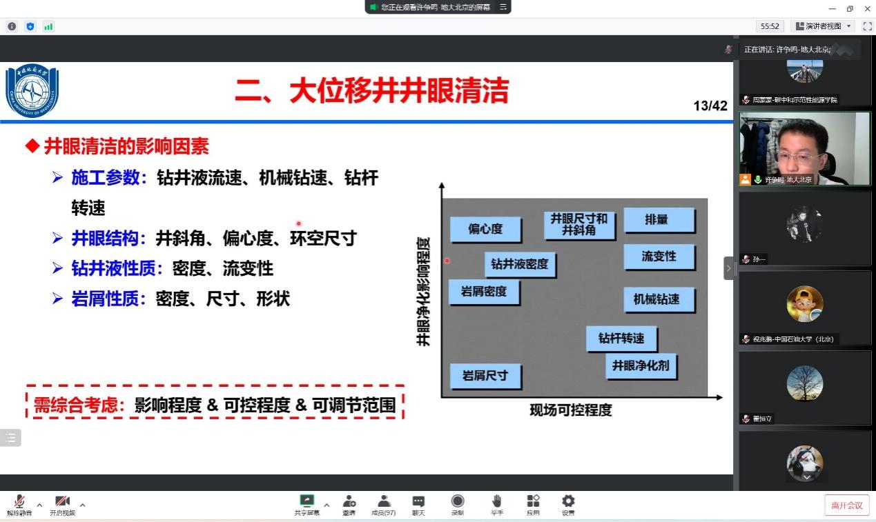 许争鸣副教授首先介绍了大位移井技术背景,他提到大位移井技术是全球油气勘探开发由浅层向深层/特深层,常规油气向非常规油气,浅滩向深海转变的重要方式。其中包括如何通过大位移钻井技术更好的维护国家油气资源主权的部分很好的调动了同学们的学习热情。同时,许争鸣副教授还提出在大位移井技术中如何判断井眼清洁,从“实验钻井”和“实际钻井”两个角度介绍了判断标准,并从钻井液流速、钻柱转速、井斜角三个方面讨论对岩屑运移的影响,给同学们提供了一些新思路。