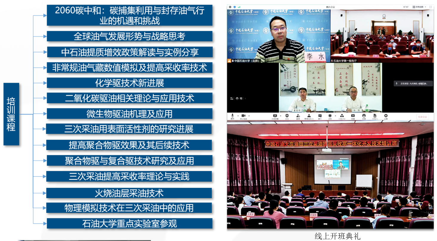 中国石油大庆油田三次采油提高采收率一体化开发技术培训班是中国石油天然气股份有限公司的重点培训项目,培训学员为大庆油田采油单位和科研单位负责三次采油的总地质师、总工程师、技术专家、油田开发业务骨干。通过开展精准地质研究、聚驱后新一代提高采收率技术、三类油层三次采油技术,以及三次采油油藏工程、采油工程、地面工程配套技术等专项培训,学员拓宽了视野,将学习的知识运用到生产实际中。