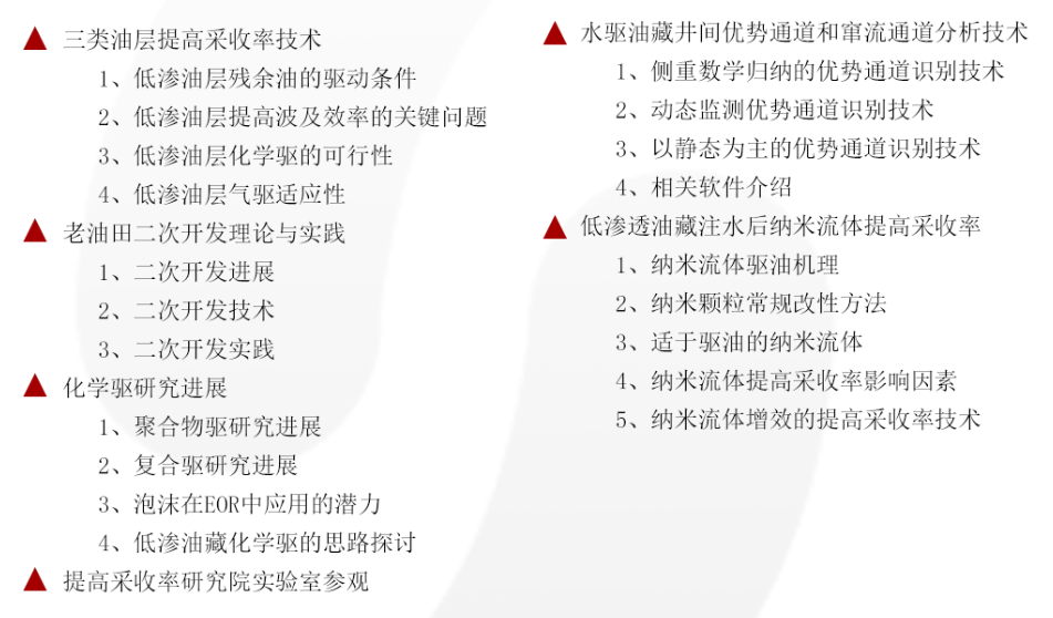 油气田提高采收率培训班作为我校的精品项目之一,已成功举办多期,基于众多学员的意见,课程体系和运行管理不断完善。课程结构设计完整,不仅有深厚的理论知识作为支撑,更有大量的来自现场的实例讲解,使学员能够理论与实践相结合,引发深思,更好地应用到工作中去。
