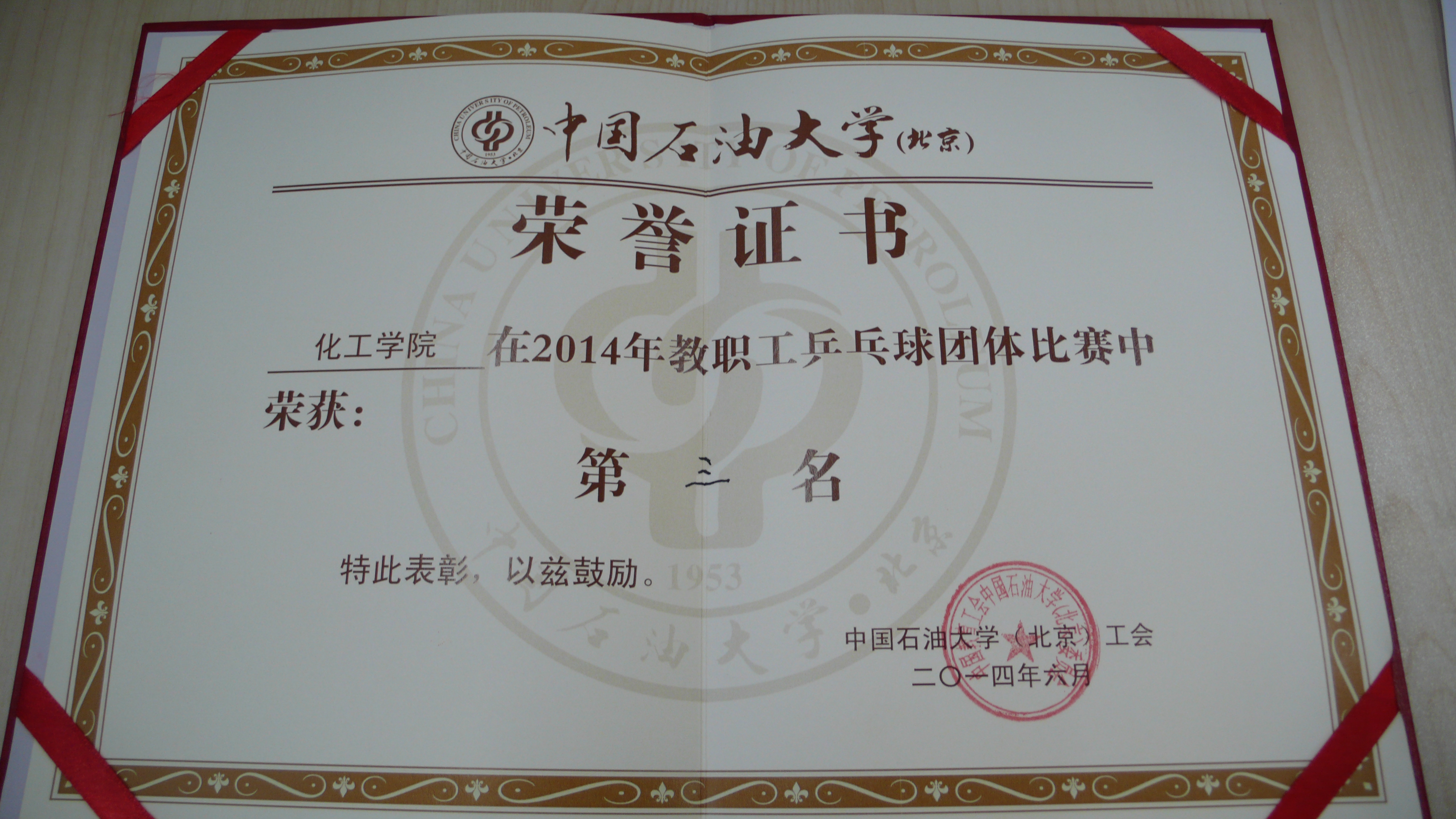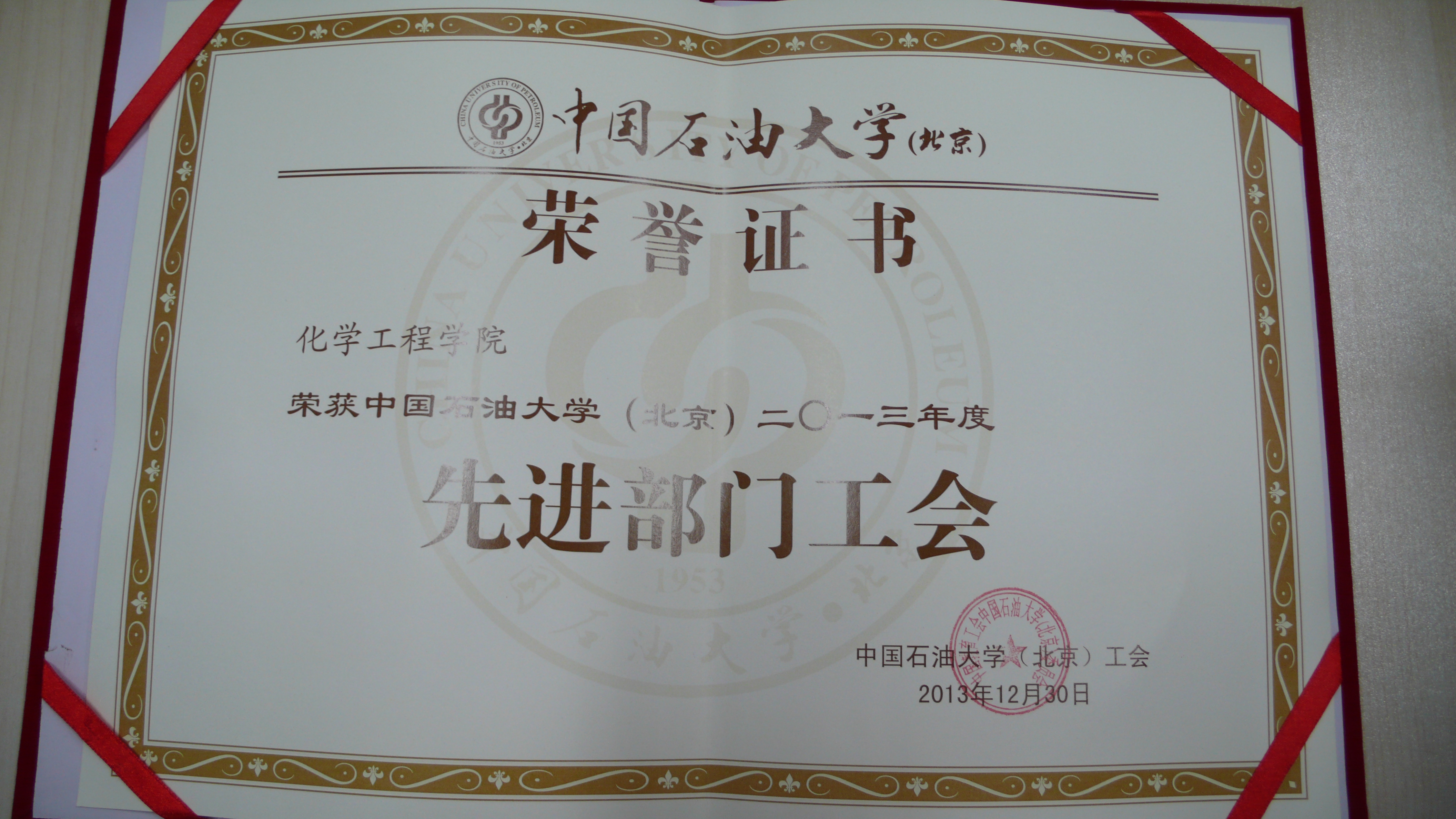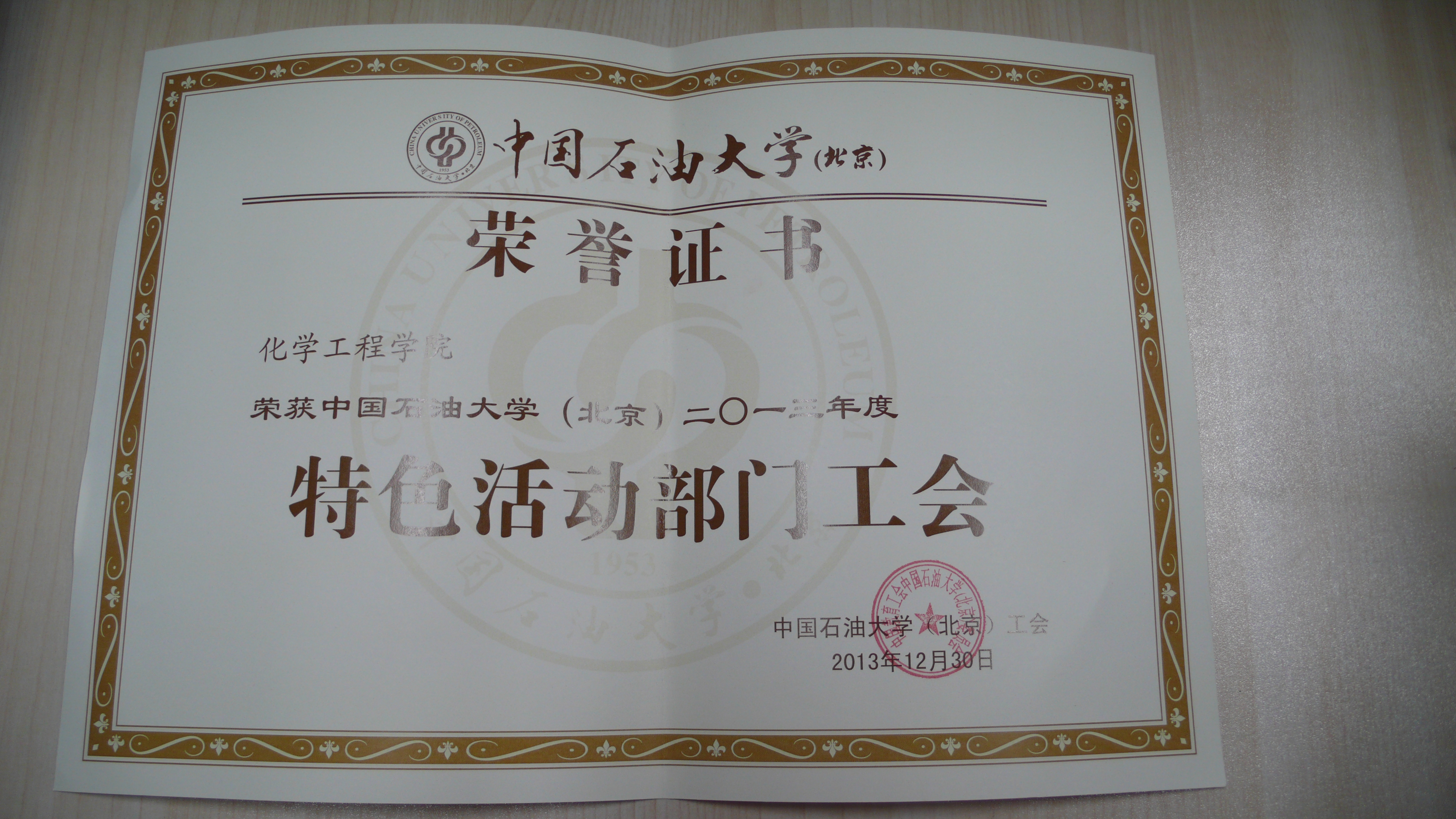 2014年化工学院工会获奖证书