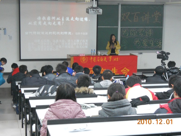谈蓍诗人从事诗歌创作多年,期间创作了多篇优秀的诗文。她从自己多年积累的经验与学习感悟出发,对现代诗歌的低迷和时代文化传播的现状进行了系统的分析,创造性指明了诗歌继续发展有声化的道路,使同学们在音乐与诗歌巧妙结合中,体会完美的意境。同时,谈老师更上升到一定高度阐释了个人素质只有建立在国民素质总体提高的基础上,才有意义,发出了诗歌不能“断档”,不能葬送在我们这代人手里的呼唤。讲座过程中,谈蓍老师声情并茂的演讲博得了同学们的热烈掌声。