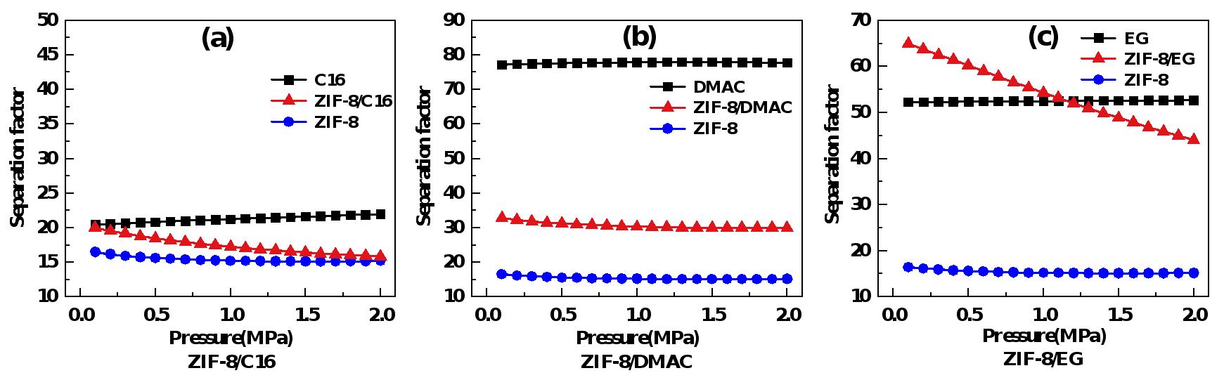 如图4(a)、(b)所示,一般情况下多孔液体(ZIF-8/C16、ZIF-8/DMAC)分离因子介于纯溶剂和多孔材料之间。而有液-固表面作用(氢键网络)的多孔液体可以实现分离因子的突破,如图4(c)。不同体系的多孔液体分离因子均随压力升高而下降,因此较低工作压力下更能发挥多孔液体耦合分离性能。