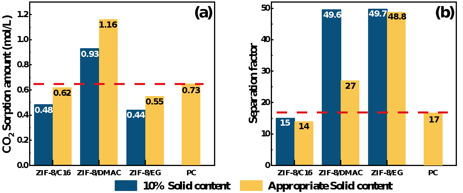如图5所示,随多孔液体中的固含率增加,耦合吸着量上升,耦合分离因子降低。通过固体材料和液体溶剂的配比可调控多孔液体分离性能,使其超越传统物理脱碳溶剂碳酸丙烯酯(PC)。