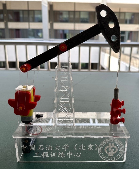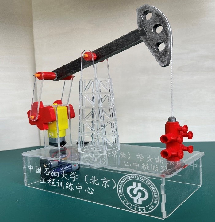 该模型以钳工手工制作与装配为主,激光加工、线切割、3D打印、车工加工零部件为辅,开发了立体拼插产品“游梁式抽油机”。体现了多个训练项目之间相互协同和不同的应用场景,形成石油特色鲜明的实训产品。实现了同学们在“沉浸式”环境下积极完成创新设计。