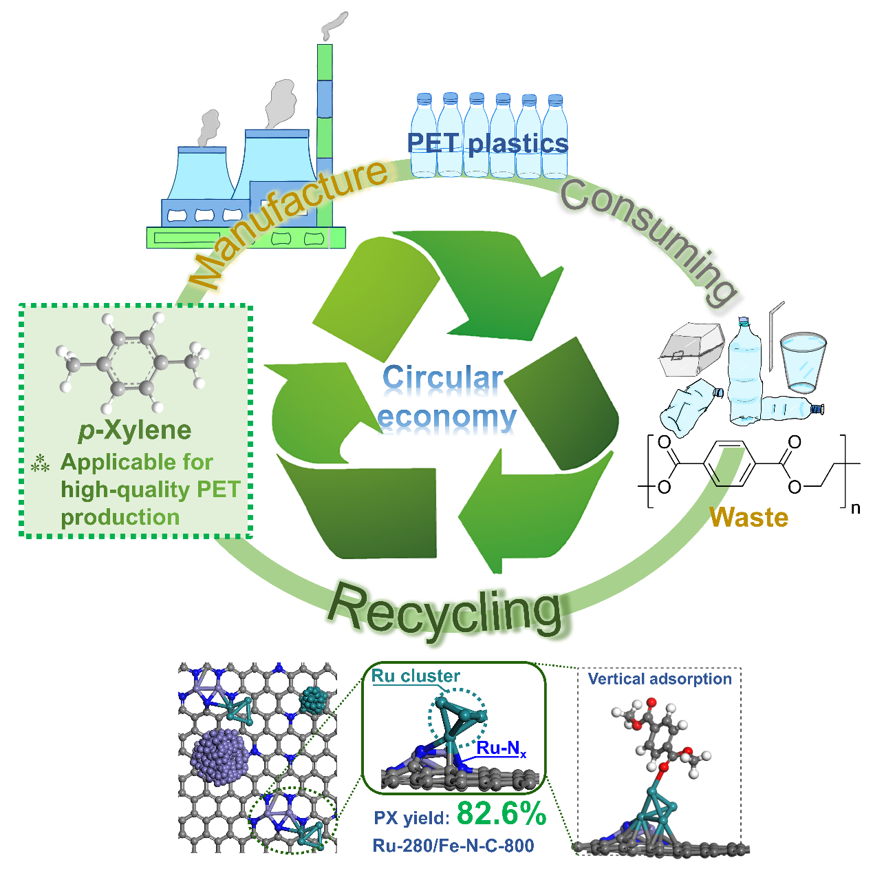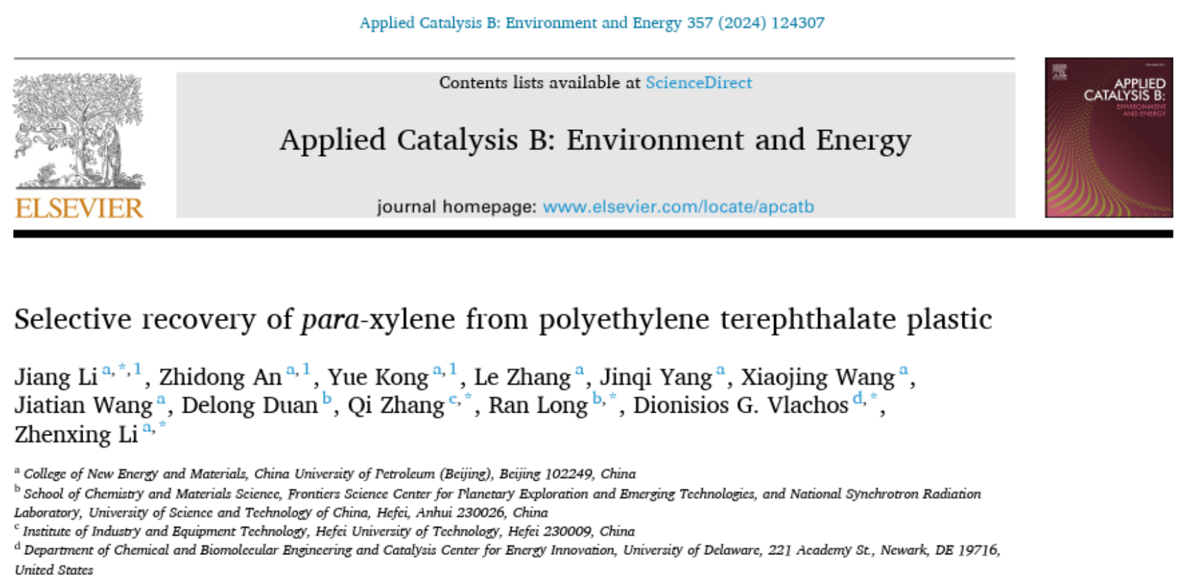 近日,在国家重点研发计划,国家自然科学基金等支持下,beat365在线唯一官网(北京)新能源与材料学院李江副教授/李振兴教授研究团队联合合肥工业大学张琪副教授,中国科学技术大学龙冉教授以及美国特拉华大学能源创新催化中心Dionisios G. Vlachos教授在塑料降解领域取得重要研究进展。团队发展了一种高选择性RuFe双金属催化剂用于一种PET的模型化合物DMT和实际PET塑料的加氢脱氧过程,成果发表在《Applied Catalysis B: Environment and Energy》上(Appl. Catal. B Environ., 2024, 357, 124307),题目为:“Selective recovery of para-xylene from polyethylene terephthalate plastic”。论文第一作者为新能源与材料学院李江副教授,新能源与材料学院博士研究生安志东和硕士研究生孔悦为共同第一作者,beat365在线唯一官网(北京)为第一完成单位。