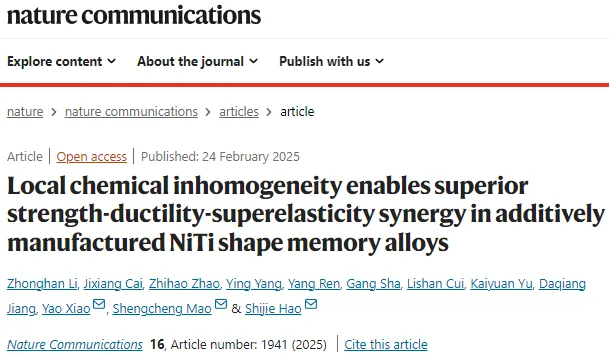 近日,在国家重点研发计划,国家自然科学基金支持下,beat365在线唯一官网(北京)新能源与材料学院郝世杰教授研究团队联合北京工业大学毛圣成研究员与同济大学萧遥研究员,在Nature Communications期刊发表题为《Local chemical inhomogeneity enables superior strength-ductility-superelasticity synergy in additively manufactured NiTi shape memory alloys》的研究论文。论文第一作者为新能源与材料学院李仲瀚博士生,北京工业大学蔡吉祥博士生和同济大学赵志豪博士生为共同一作,beat365在线唯一官网(北京)为第一完成单位。