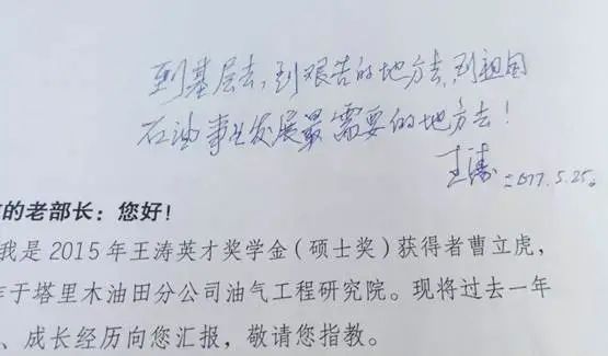 曹立虎至今保留着原石油工业部部长王涛给他的寄语:“2015年,我获得王涛英才奖学金,老部长鼓励我到新疆塔里木去。工作两年后,给老部长写信汇报工作,老部长给我写了寄语‘到基层去,到艰苦的地方去,到祖国石油事业发展最需要的地方去’!”