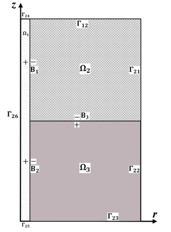 的下标数,其中图中的加号和减号表示电势从边界的负号侧向正号侧增加。 结合边界条件,该问题可概括为阶跃不连续边值问题,如式(9)所示。 通过上述解空间的约束,可以得到不同地层条件下的空间场分布。