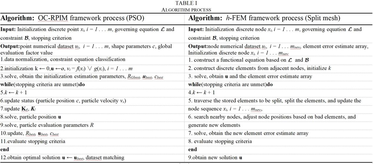 基于给出的解空间方程以及边界约束,可采用OC-RPIM算法,进行求解,其流程如下图所示,为便于比较该算法的优势,在下图中还给出了h自适应有限元法的算法流程,该算法是目前最为常用的自适应数值求解方法。