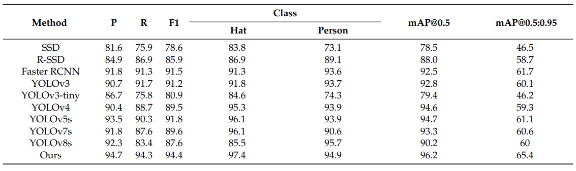 为了定量分析所提方法与其他方法的检测性能,在表1中给出了GDUT-HWD数据集上各项指标的实验结果。对比包括SSD、R-SSD、Faster RCNN、YOLOv3、YOLOv3-tiny、YOLOv4、YOLOv5s、YOLOv7s、YOLOv8s。以平均精度均值(mAP)评价指标为例,与其他方法相比,所提方法在5个类别中均取得了较高的检测精度。同时,在评估精度和F1分数时,所提出的方法与其他方法相比也在不同识别类别中提高了检测精度。如表2所示,在SHWD数据集上,当IoU阈值设置为0.5时,所提方法的检测准确率达到96.1%。在帽子类别和人类别上的准确率分别达到97.4%和94.9%。当IoU阈值在0.5 ~ 0.95之间时,mAP达到65.4%,比YOLOv5s提高了4.3%。为了进一步验证HR-YOLO的鲁棒性,在CUMT-HelmeT数据集上与SSD、Faster RCNN、YOLOv3、YOLOv5s、YOLOv7和YOLOv8s不同方法进行了对比实验。表3列出了不同方法的precision、recall、F1、mAP、Params和GFLOPs的值。从表中可以看出,与其他六种方法相比,我们的方法表现出最高的准确率、召回率、F1值、mAP@0.5和mAP@0.5:0.95。此外,在precision、recall、F1、mAP@0.5和map@0.5:0.95值上,与YOLOv5的结果相比,分别达到了3.8%、6.1%、5.1%、5.6%和7.7%的提升。