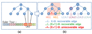 时,我们需要标记生成树上树其他树外边。然而,在新添加的边和其他非树边之间建立连接会带来挑战。在本文中,为了提高效率,我们创建了一个以节点和为起点的互斥区域,作用于边,这样就可以跳过具有由同一边标记的互斥端点的离树外部,如图3(b)所示。最后,为了减少内存和时间开销,我们将LCA作为一个集合对边进行分组。