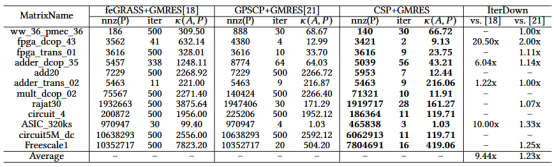 表1:CSP、feGRASS、GPSCP等方法预条件子和迭代次数对比