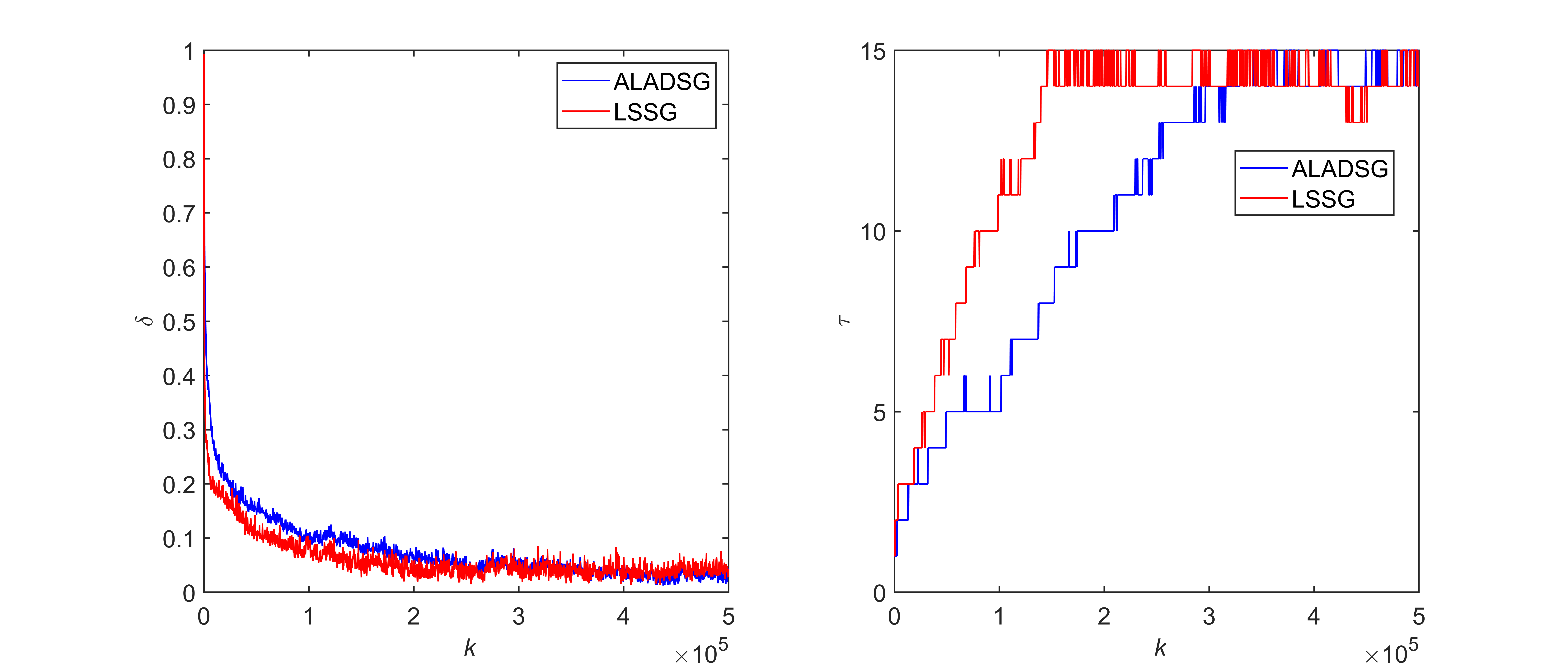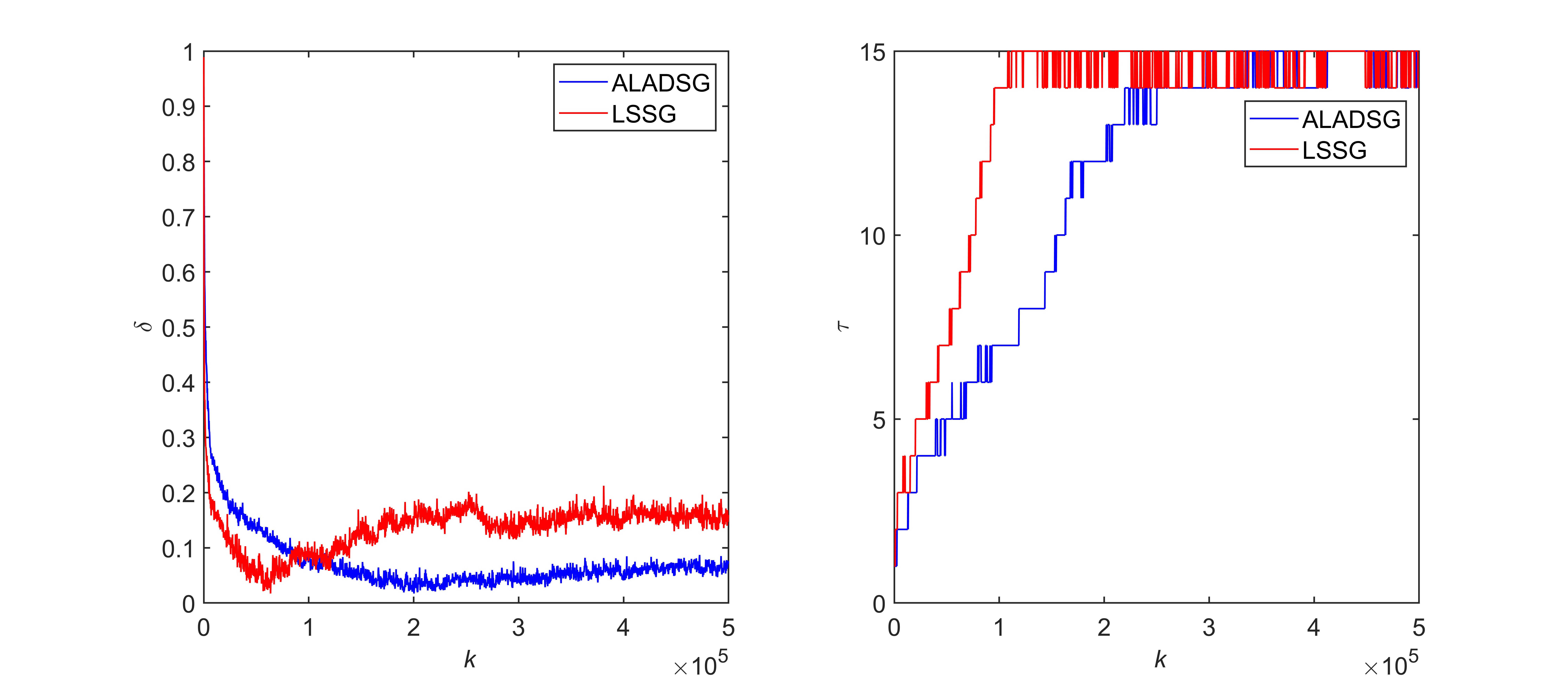当辨识过程中仅存在白噪声时,基于最小一乘准则函数的两步法(ALADSG)和基于最小二乘准则函数的两步法(LSSG)的辨识曲线和辨识结果如图3和表1所示。