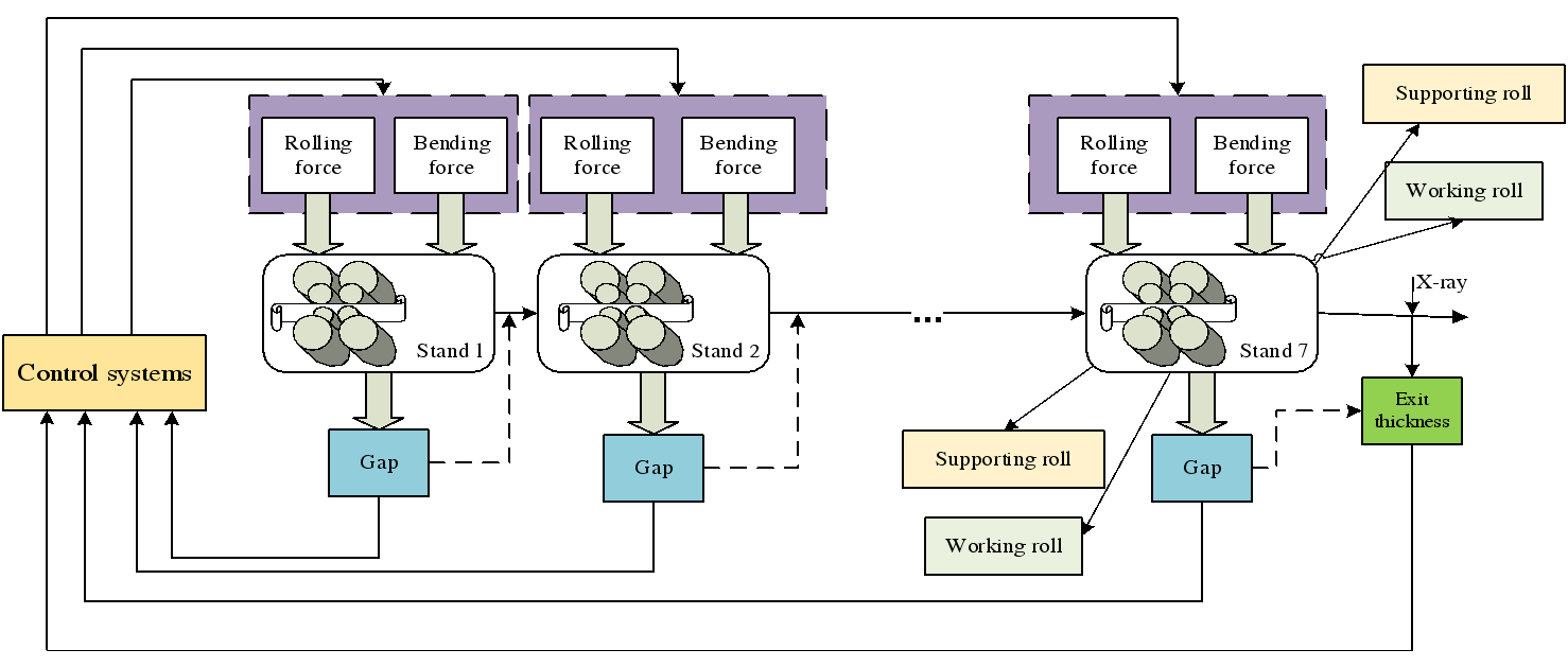 以带钢热轧过程为例,该故障是由F4辊隙控制执行器故障引起的。故障发生后,F4辊隙采样受到影响,随后,由于反馈控制的作用,后续机架的辊缝和轧制力会发生变化,从而影响最后一机架的出口厚度。作为一种与质量有关的故障,故障发生在过程运行20s后,即从2000个采样点检测到故障出现。