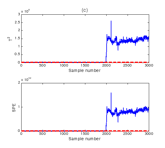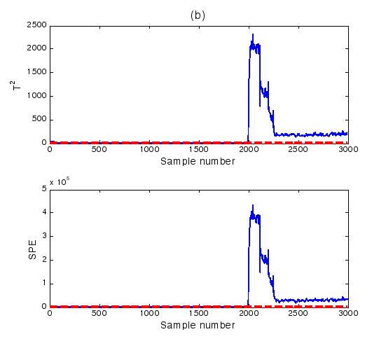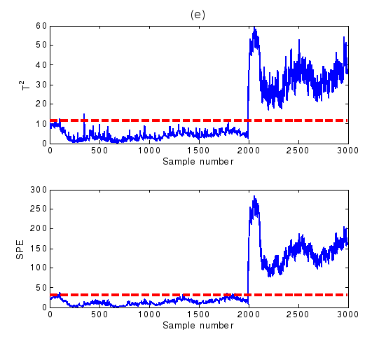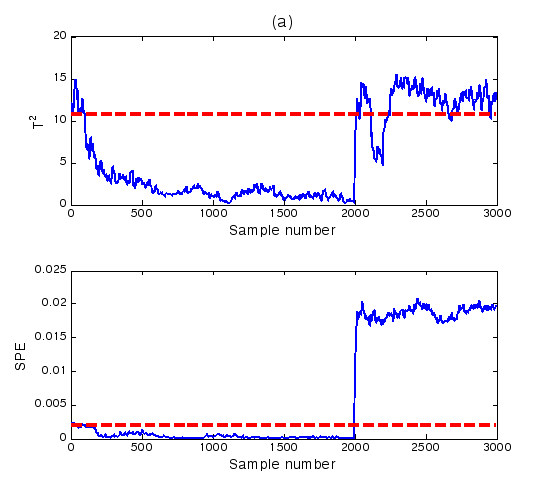 对于实时采样数据或者在线操作过程数据到来时,对比统计量与控制限的大小,若超过控制限,则系统判定为故障发生,否则系统正常。