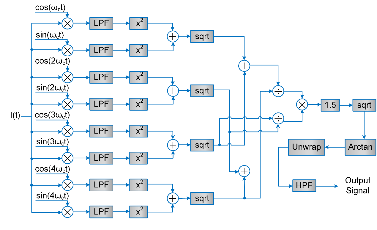 将干涉信号与载波调制信号的一至四次谐波正余弦分量相乘混频,再经过一个低通滤波器,可以得到八个滤波信号,对其正弦和余弦分量进行平方和开方操作,能够消除载波相位延迟θ,得到