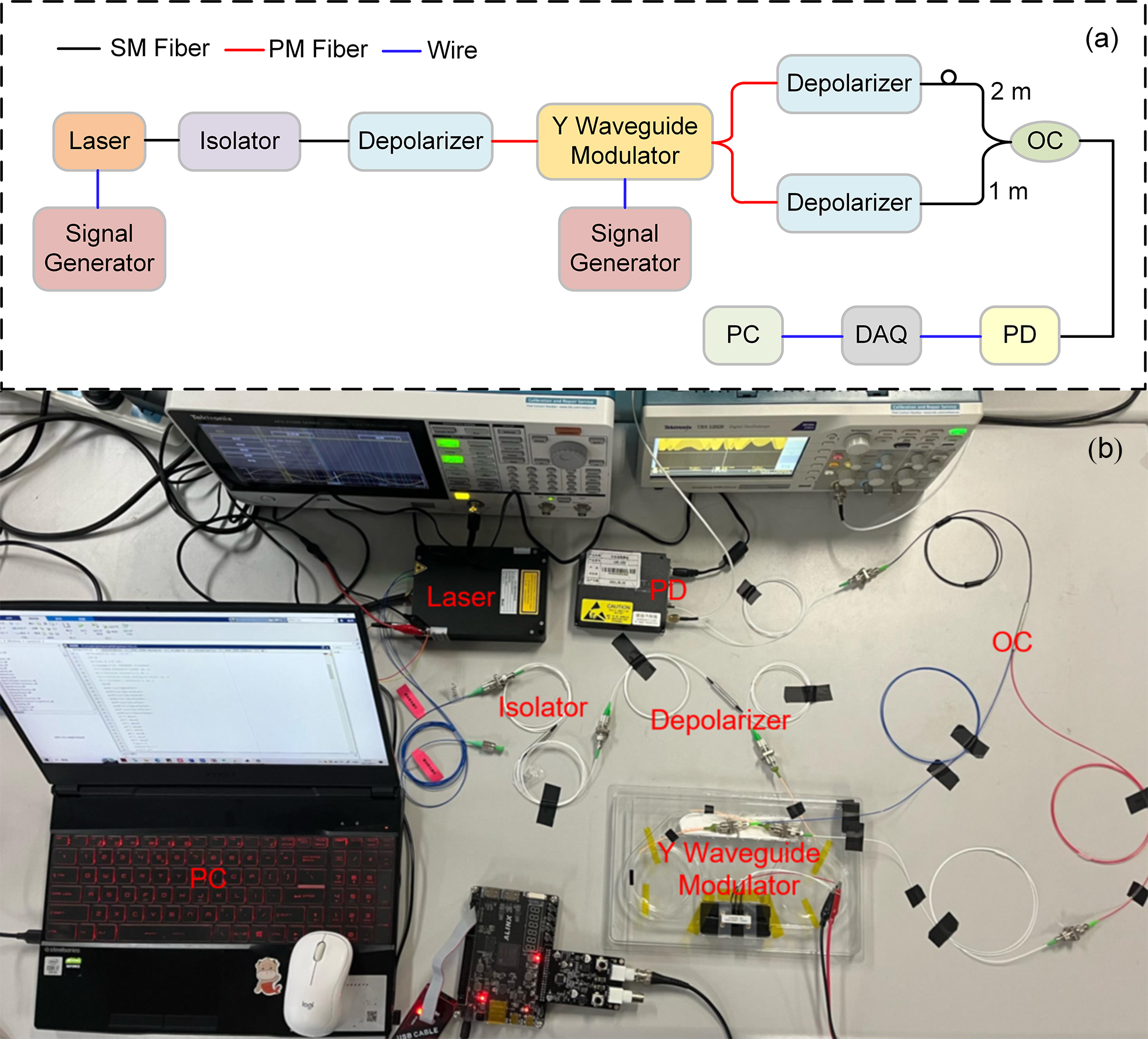 图2 马赫-曾德干涉仪实验系统 (a) 实验装置示意图 (b) 实验装置实物图