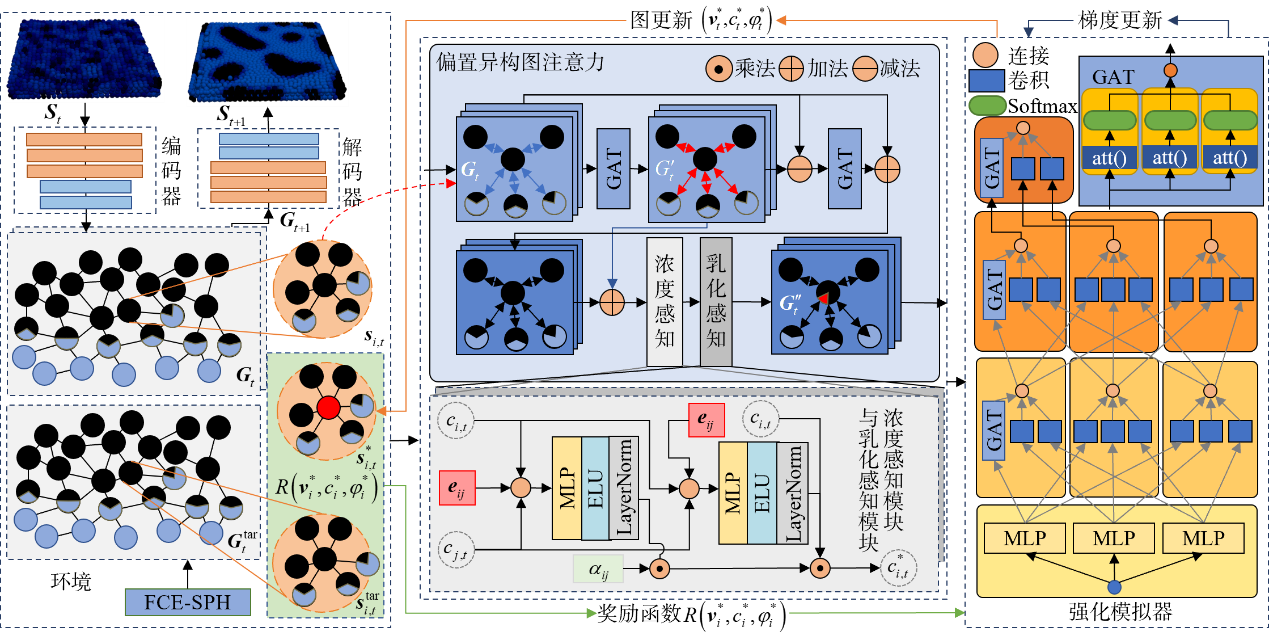 本文提出一种脉动风场Cahn-Hilliard乳化SPH方法(fluctuating wind field Cahn-Hilliard emulsion smoothed particle hydrodynamics, FCE-SPH),结合脉动风场描述海上溢油的混合和乳化分解过程。针对模拟效率不高的问题,设计了两相流物理感知深度强化学习偏置图注意力网络,以加速流体模拟仿真,通过异构偏置图注意力模块,增强网络获取粒子特征的表达能力。