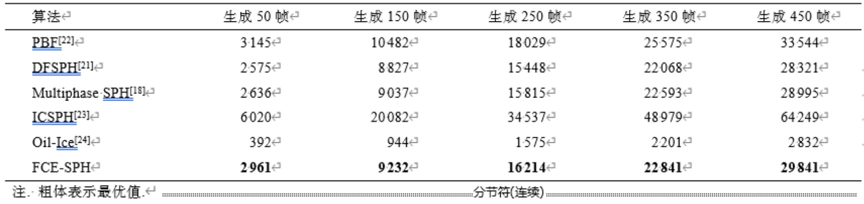 图4给出了6种算法的海上溢油模拟结果,假设海上风场方向为逆溢油方向,风速设置为15 m/s。可以看出,PBF算法存在粒子发散现象,第150帧至第350帧油粒子分散较为明显,泄漏体边缘不够光滑;DFSPH算法虽没有出现粒子发散现象,但原油溢出后第250帧产生粒子堆积现象,溢油边缘没有体现油水两相流耦合效果;Multiphase SPH较好地处理了两相流的交互运动效果,泄漏体边缘呈流线型,并且由于溢油喷射具有初速度,泄漏体两侧呈漩涡状分布;ICSPH泄漏体边缘不光滑且有分散的油粒子,溢油内部出现不稳定现象并产生空腔,如表1所示,由于FCE-SPH算法融入相分离、乳化和随机脉动风场模型,因此不同程度地增加了原油泄漏扩散模拟时间。