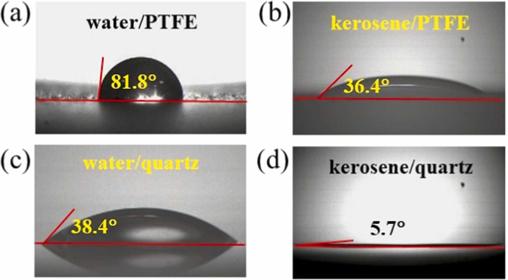 图3(a)水和(b)煤油和PTFE的接触角;(c)水和(d)煤油与石英的接触角