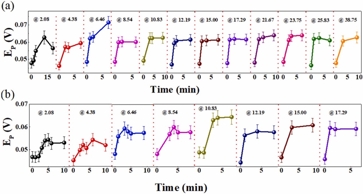 如图2所示,以开始注入油相的时刻为零点,对油水两相流进行连续的扫描以捕获不同时刻两相流的太赫兹光谱参数。随着时间的推移,在不同流动条件下得到的时域峰值信号的变化规律出现了类似变化趋势,整个过程可分为快速增长和稳定两个阶段。