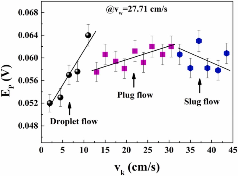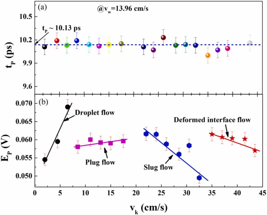 图6和图7展示了在固定煤油的表观速度的情况下,改变水相流速的实验结果。Ep的结果表明,该情况下仅出现了液滴流、塞流、段塞流三个阶段,两相流的流型模式强烈依赖于煤油的流速。因此,可以通过参数β=k/vw建立流型和THz-TDS测试结果之间依赖关系。