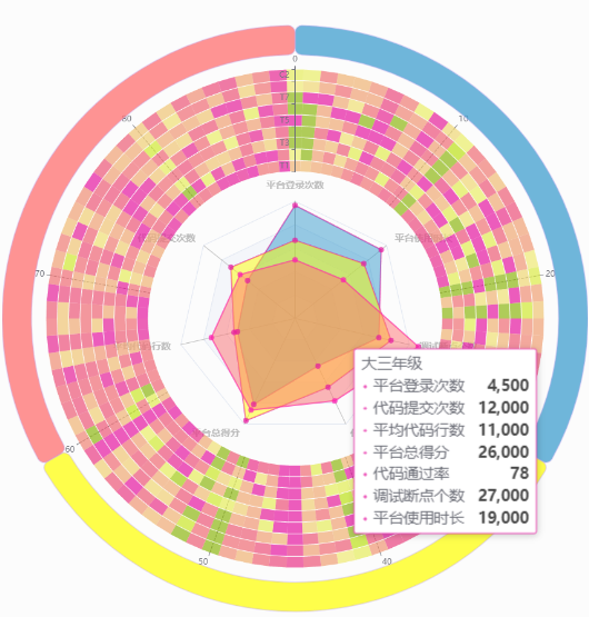 多维度环状热力图-雷达图集成展示班级、课程、编程作业和考试成绩在不同学期的分布,如图4所示。并且从整个年级的角度展现整体的编程行为数据,如平台登录次数、平台使用时长、断点设置个数、代码通过率、代码提交次数、总得分等。在热力图下方,采用面积图展示不同学年整体作业的加权平均得分,能够直观地了解同一届学生不同学年的成绩变化,以及同一学期作业成绩的变化,便于分析学生整个学期的学习状态。