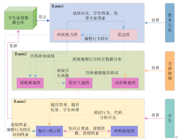 图3所示为MPDVAS分析导航, 支持教务人员、主讲教师和学生3类角色对学生编程行为特征进行分析, 通过多视图交互实现优化培养方案、调整教学计划和提高学生编程能力水平.