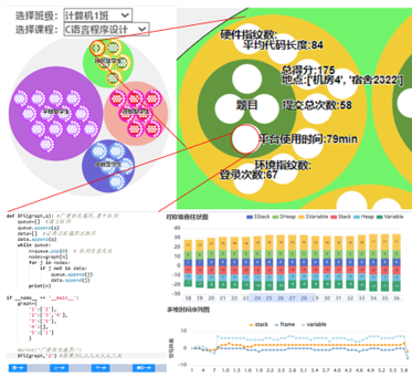 图5所示为学生编程调试行为与代码相似度分析界面,点击气泡图中某位学生的气泡可以查看其具体的编程信息数据,选择某个编程题目对学生编程行为和代码相似度进行联合分析,帮助教师了解具体学生编程能力,进行分类教学管理。图6展示了学生作业代码调试过程中的内存状态,结合堆叠图中的堆栈情况进行比较分析。