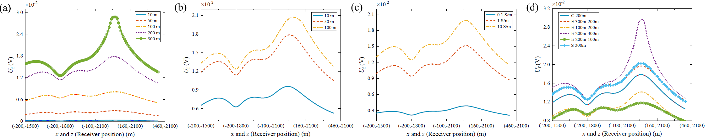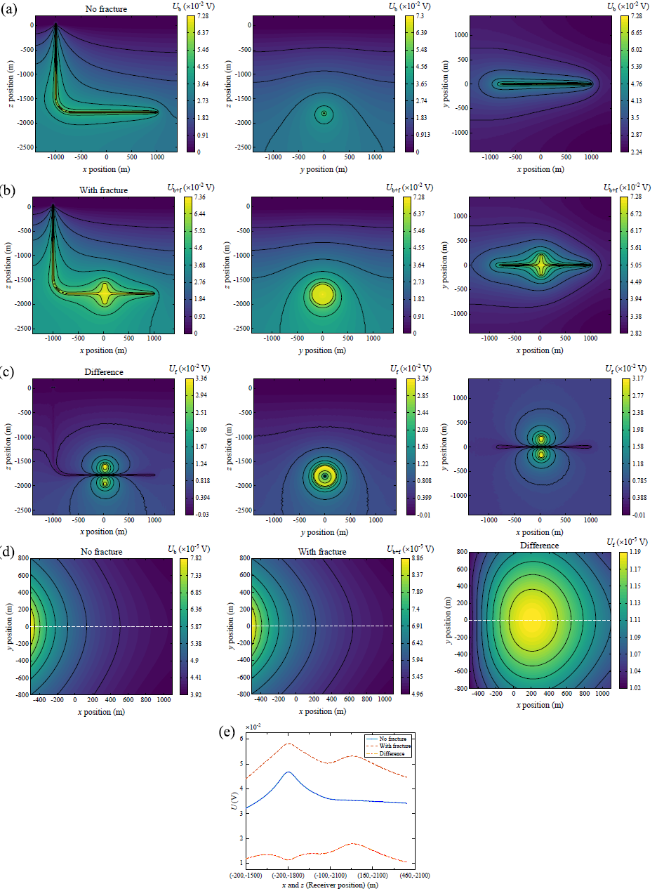 图1显示了验证模型的二维横截面,图2显示了响应结果。不难发现在压裂前信号幅值随着靠近套管井眼而增加,然而压裂后,信号振幅整体增加,并且接收器水平移动时可以观察到压裂带的峰值信号。通过比较压裂前后的电位差,我们可以识别出峰值和谷值,分别表示裂缝带沿z轴和x轴的信号强度。跨井测量方法的信号幅度比井地测量方法大3个数量级,显著提高了裂缝带的可监测性。因此,跨井测量方法对于监测水力裂缝是可行的,并且可以为电流测量提供令人信服的结果。图3显示了不同参数下对称裂缝带的电位响应,图4显示了复杂地质和井眼条件下的电位响应,图5显示了分段压裂带的电位响应。
