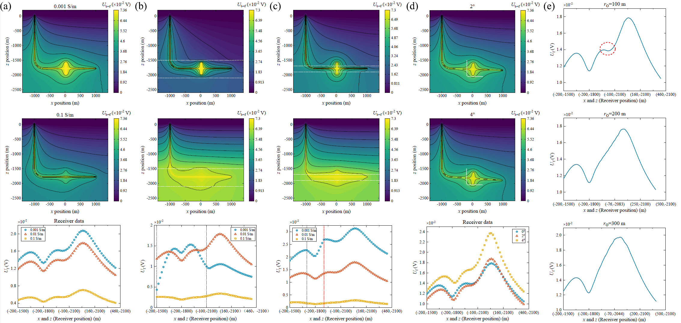 图4 对称裂缝带中的电位响应随背景电导率、套管井倾角和裸眼转弯半径而变化