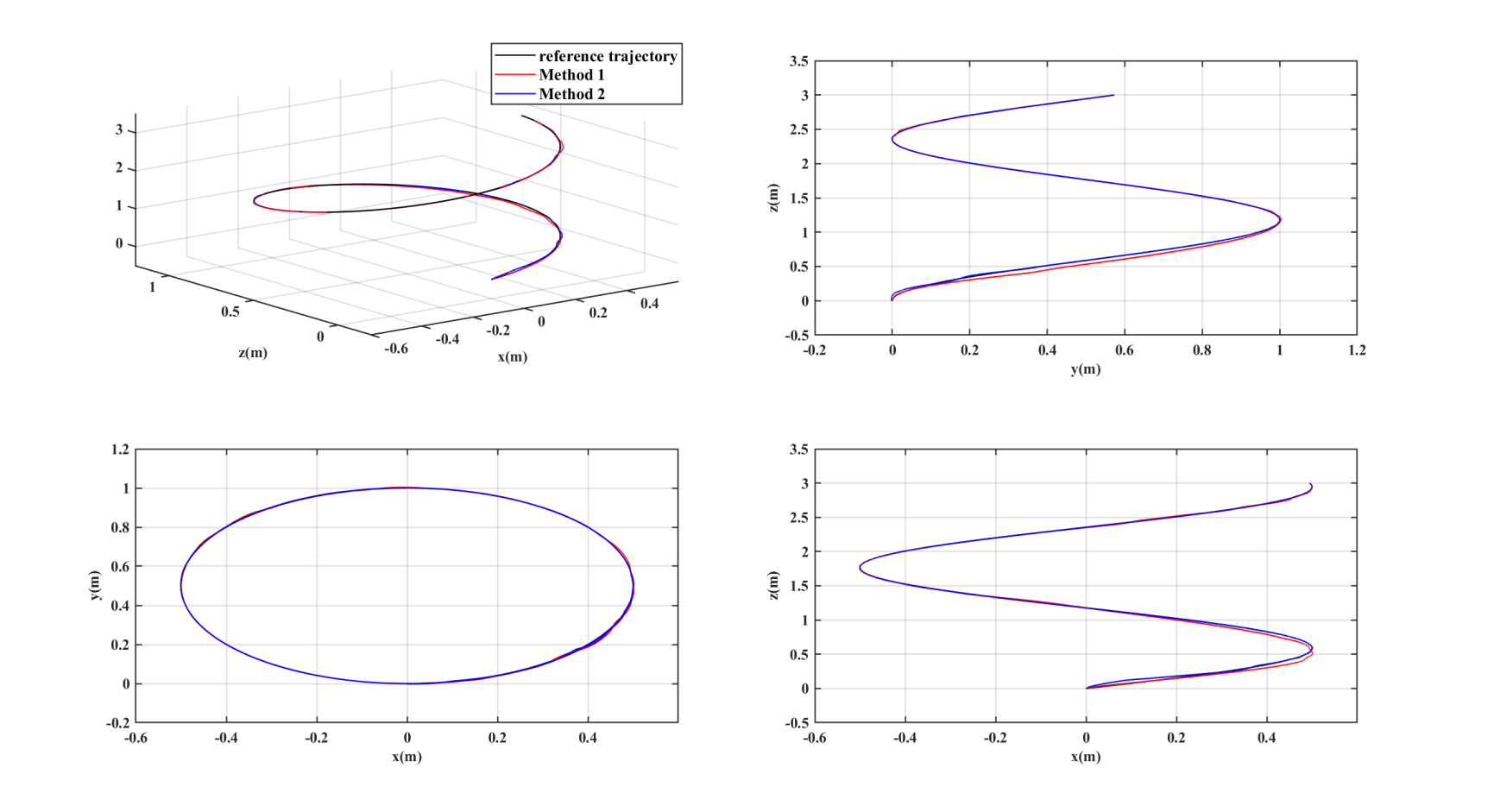 当AUV执行轨迹跟踪任务时,在加入持续的不确定性海流干扰后,本文所提出的新方法2相比于方法1的抗干扰能力更强,初始阶段偏离参考轨迹的幅度较小,且能在很短的时间快速地跟踪上参考轨迹,而方法1的实际运行轨迹具有明显的波动,抗干扰能力较差。