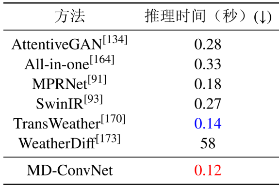 同时,进行了实验对不同恢复方法的推理时间进行比较分析,如下表所示。在所有方法的测试实验中,统一采用相同的输入图像尺寸256x256。值得注意的是,MD-ConvNet具有最快的推理速度,每张图像仅需0.12秒就可以完成图像恢复。仅基于卷积的模型架构成为提高其效率的关键因素,并且采用多尺度和编码器-解码器的设计进一步提升特征丰富度和利用率,从而达到基于较大参数模型Transformer和扩散模型相同的实验性能。