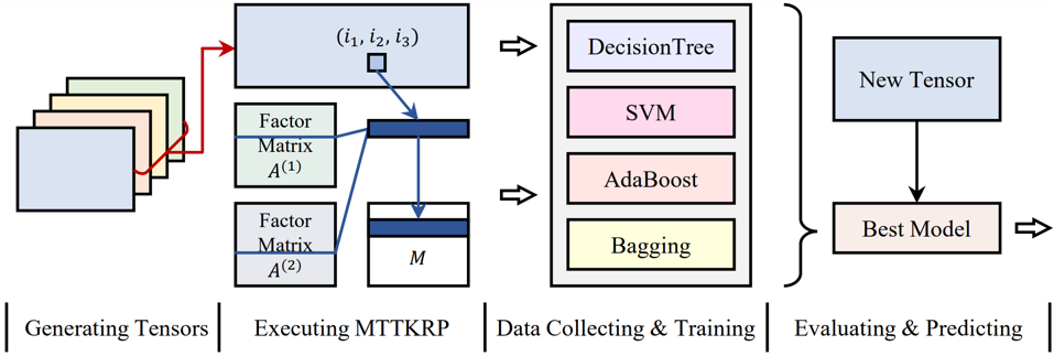 该策略的核心在于动态选择最优的参数组合,以适应不同特征的矩阵化张量。通过分析张量的维度和分布特征,提取张量的关键特征参数,包括张量的全局特征和局部特征,以预测MTTKRP操作的执行情况。利用提取的特征参数,通过机器学习训练不同的启动参数选择模型,输出张量启动参数的最优组合。在内核计算过程中,将频繁访问的数据和中间结果存储在共享内存中,以减少数据访问的延迟。