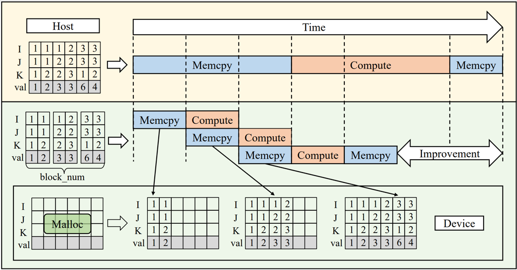 该策略首先对COO格式的稀疏张量进行分段,每个分段包含一部分非零元素及其相应的坐标信息。然后根据GPU的性能和内存容量以及段的数量创建不同数量的CUDA流,每个流负责传输和处理一个或多个特定的数据段。当一个数据段从CPU传输到GPU时,GPU可以处理之前已经传输完成的数据段,从而减少等待时间,提高资源利用率。