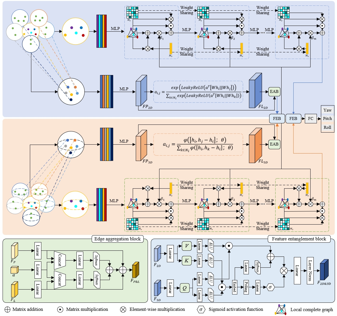 本文提出了一种新的具有区域和差分感知机制的特征金字塔网络,从RGB人脸图像中检测二维关键点,以提供平面信息,进而提高三维人脸重建的质量。在此基础上,构建粒子群优化的对比学习,通过二维和三维关键点的交替匹配,实现跨模态关键点重定位,将粒子群优化的全局搜索能力与对比学习的局部特征交互能力相结合,获得鲁棒结果。最后,提出了二阶双线性注意图卷积来纠缠多模态特征,利用多模态信息的互补性来增强面脸关键点的几何分布与头部姿态角度之间关系的探索能力。