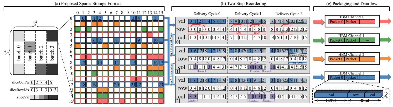 图 1:稀疏存储格式、两步重排序算法和数据流处理方案