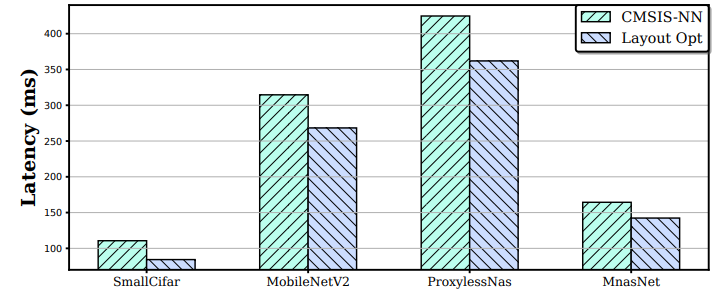 此外,我们分别评估了CoMCU的IOP优化和数据布局优化的性能,如图4和图5所示。从图中可以看出,CoMCU的两种优化技术能够分别实现1.4倍和1.2倍左右的推理加速。