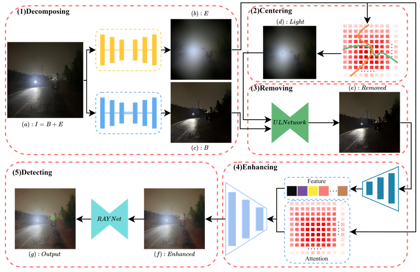 图1. DCRE模型的结构。(1)表示图层分解模块,用于将输入图像(a)分解为光效层(b)和背景层(c)。(2)表示高斯拟合模块,用于定位图像的光源中心,(d)中的绿点表示拟合结果。(3)表示消除反射耀斑模块,该模块基于光源中心和光学中心对称先验信息对背景层(c)中的反射耀斑进行定位和消除。(4)表示低光增强模块,该模块使用光效层(b)作为注意力图,引导模型对去除反射耀斑后的结果(e)的低光区域进行增强,得到增强图像(f)。(5)表示最终的检测模块,本文使用RAY-Net完成检测任务,得到检测结果(g)。