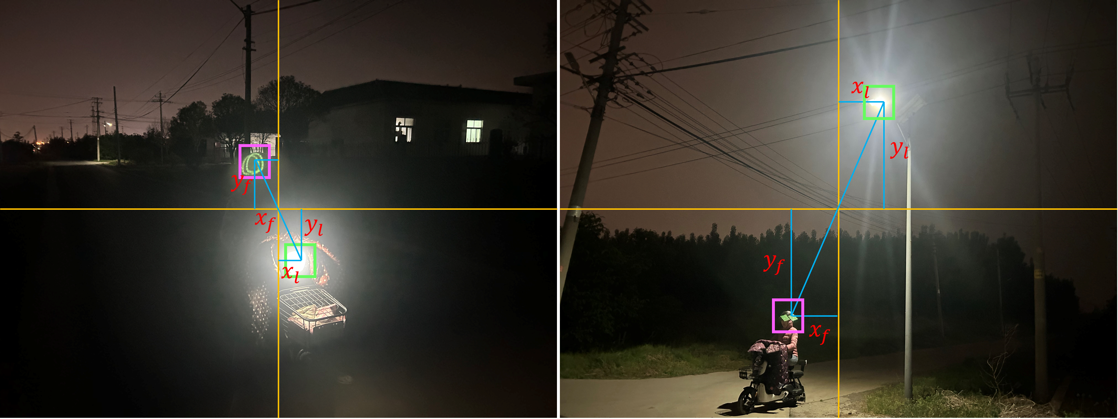 受Dai等人的启发,我们发现智能手机和相机在捕捉强光时会在图像中留下反射耀斑。由于摄像镜头内部组件的反射,产生这种反射耀斑通常是不可避免的。耀斑会影响图像的质量,这在交通监测领域中尤为突出,如图2所示。如果这些耀斑恰好在摩托车驾驶员头部的位置,将不可避免地影响检测任务的准确性。如图3所示,光源和其产生的反射耀斑的位置总是关于相机镜头中心呈现对称关系。本文使用三种品牌的智能手机(iPhone 14 Plus、华为荣耀90 Pro、小米14 Pro)、尼康相机(尼康Z9)和交通监控摄像机(9361-S)进一步验证了这种光学先验信息。