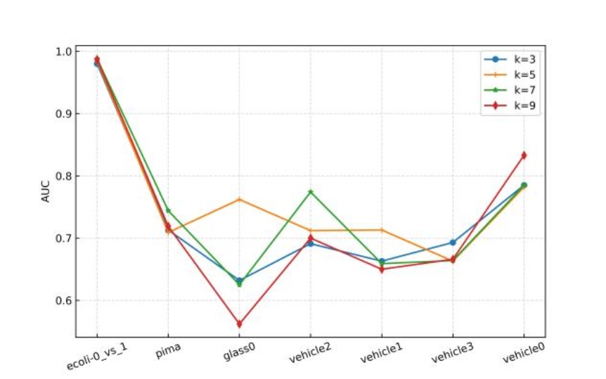 样本选择算法是解决类不平衡问题的研究方法之一,需要根据数据集中的样本信息,选择信息量较大的样本加入训练集。当数据集中少数类样本数量较多时,可以使用传统的重采样技术增强少数类或删除多数类,但是当数据集中的少数类样本较少时,需要筛选训练集中的多数类样本,从而提高模型的整体性能。对于高度不平衡数据集,LMD-WNG的性能更加稳定,并不会受到类不平衡问题的影响。然而,LMD-WNG样本选择算法的性能将会随着数据集不平衡比的增加而变得对超参数k更加敏感。因此,需要更高效的参数选择方法确定超参数。LMD-WNG是首次将数据转化为图结构并选择样本的算法。因此,在未来的工作中,可以将它与其他方法结合使用,并且能够充分探索根据数据结构选择样本。