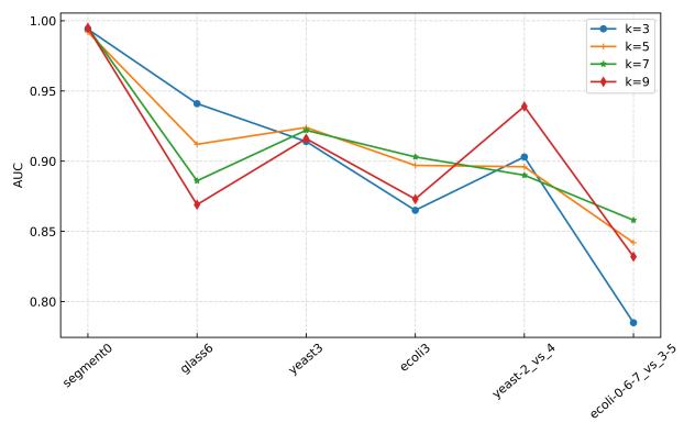 在30个不平衡数据集上进行参数敏感实验,并与其他先进方法进行对比实验,实验结果如下所示。