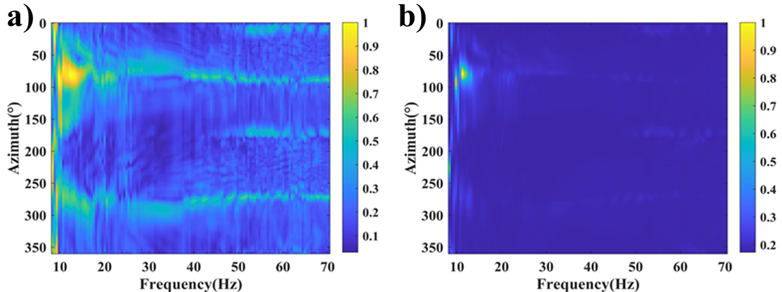 利用特征值分解,在不考虑随机噪声的情况下,根据特征值大小将SCM划分为面波信号子空间和零子空间。其中,面波信号子空间由第一个大特征向量构造,而零子空间则由其他较小的特征向量构造。利用零子空间与导向矢量的正交性,从而获得高分辨率的频率-方位-速度谱。