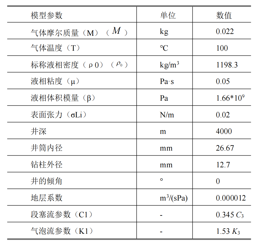 基于Fjelde等人提供的模拟数据,设立一个井深为4000米,内径为26.67mm,外径为12.4mm,钻井液为水的井筒模型,以井口回压为操纵变量,对简化两相流模型设计非线性模型预测控制器。具体参数如下表:
