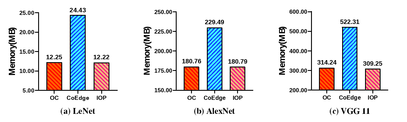 与OC方案相比,IOP在执行LeNet、AlexNet和VGG11模型推理时分别节省了31.53%、21.06%和12.82%的延迟。相较于CoEdge,IOP分别节省了12.05%、16.83%和6.39%的延迟。此外,与CoEdge方案相比,IOP在LeNet、AlexNet和VGG11执行推理过程中的峰值内存占用分别减少了49.98%、21.22%和40.79%。