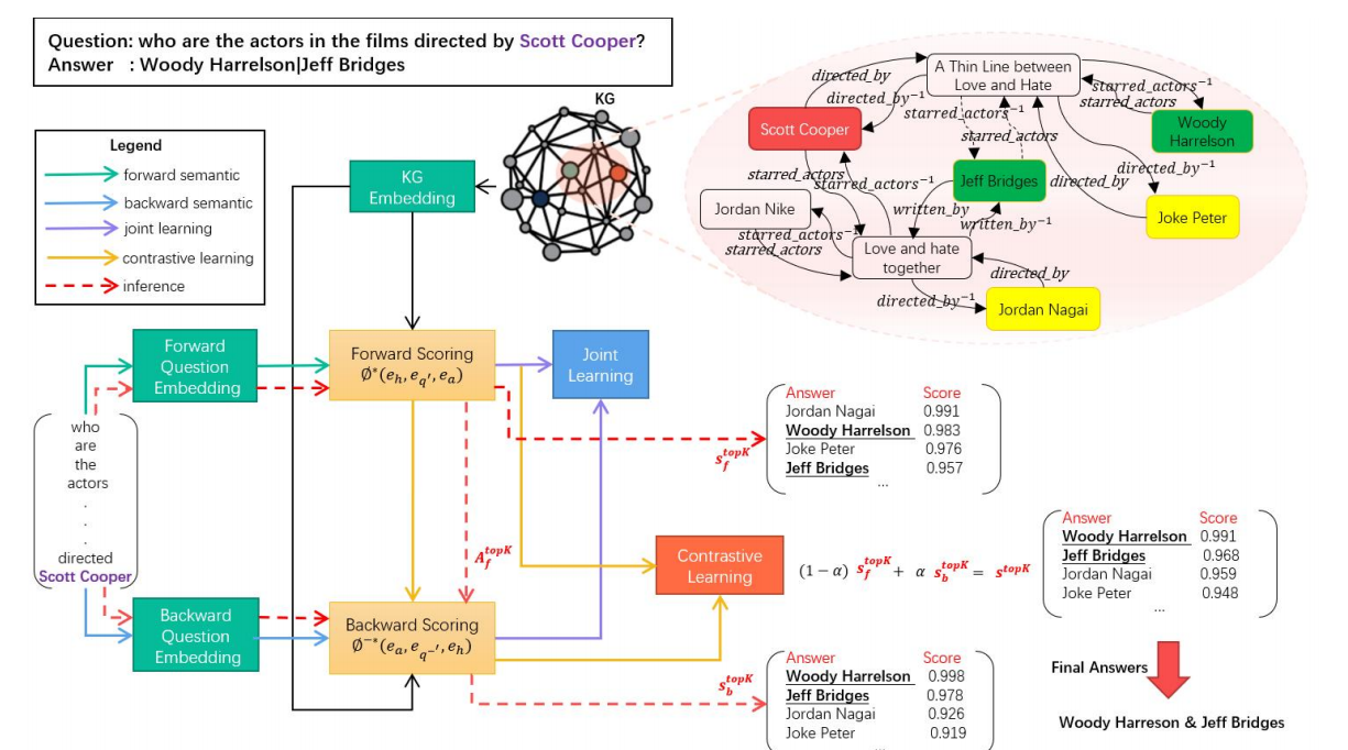 组成,利用前两个模块生成的语义向量进行推理计算,并对候选答案进行排序。在模型训练阶段,设计了一种两阶段学习方法,采用联合学习和对比学习来训练正向和反向推理。在模型预测阶段,将正向和反向推理结合起来,使用反向推理对正向推理的答案进行反向检验,从而推断出正确的答案。这种方法充分利用了知识图谱中实体之间的正反向推理语义信息,不仅提高了问答系统的性能和准确性,同时答案也具备一定的可解释性。