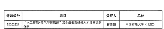 近日,北京市高等教育学会正式公布了2025年度立项课题名单。由我院林伯韬教授主持的《“人工智能+油气与新能源”复合型创新拔尖人才培养机制探索》项目,成功获批重点课题立项。