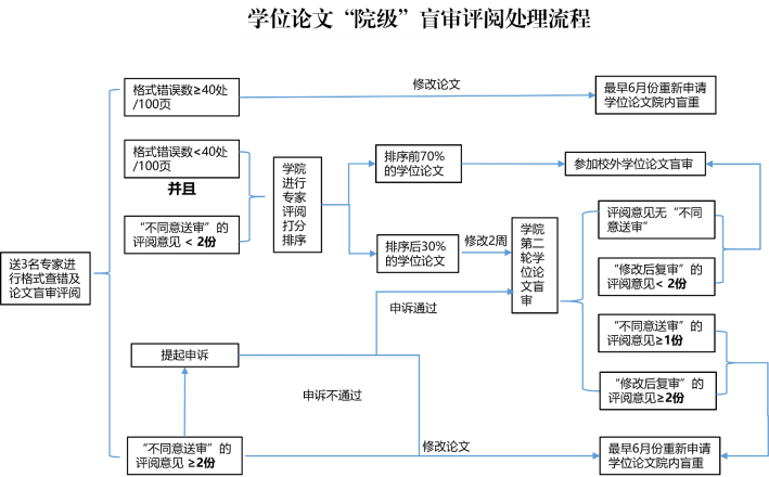7.第一轮盲审通过的学位论文,学院根据各位专家评阅打分情况进行排序。排名后30%且有“不同意送审”或“修改后复审”意见的论文,需要修改2周后,进行第二轮院内盲审。其他学位论文按评阅意见修改后,可以参加校外论文盲审。
