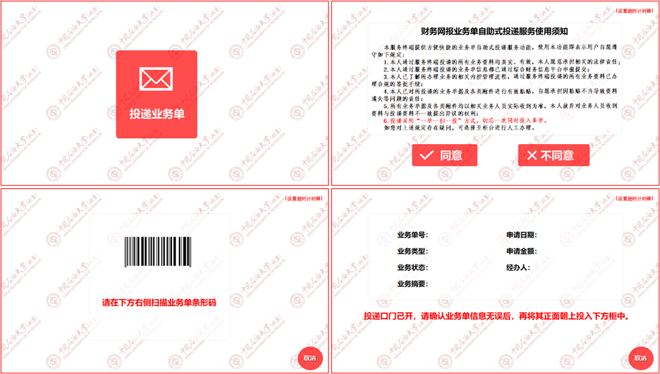 (三)投递采用“一单一扫一投”方式,切忌一次同时投入多单,按照投递机下屏幕提示信息依次操作进行投递:点击“投递业务单”、阅读“使用须知”、扫描业务单条形码、投入业务单,投递成功后可选择继续投递或结束投递。